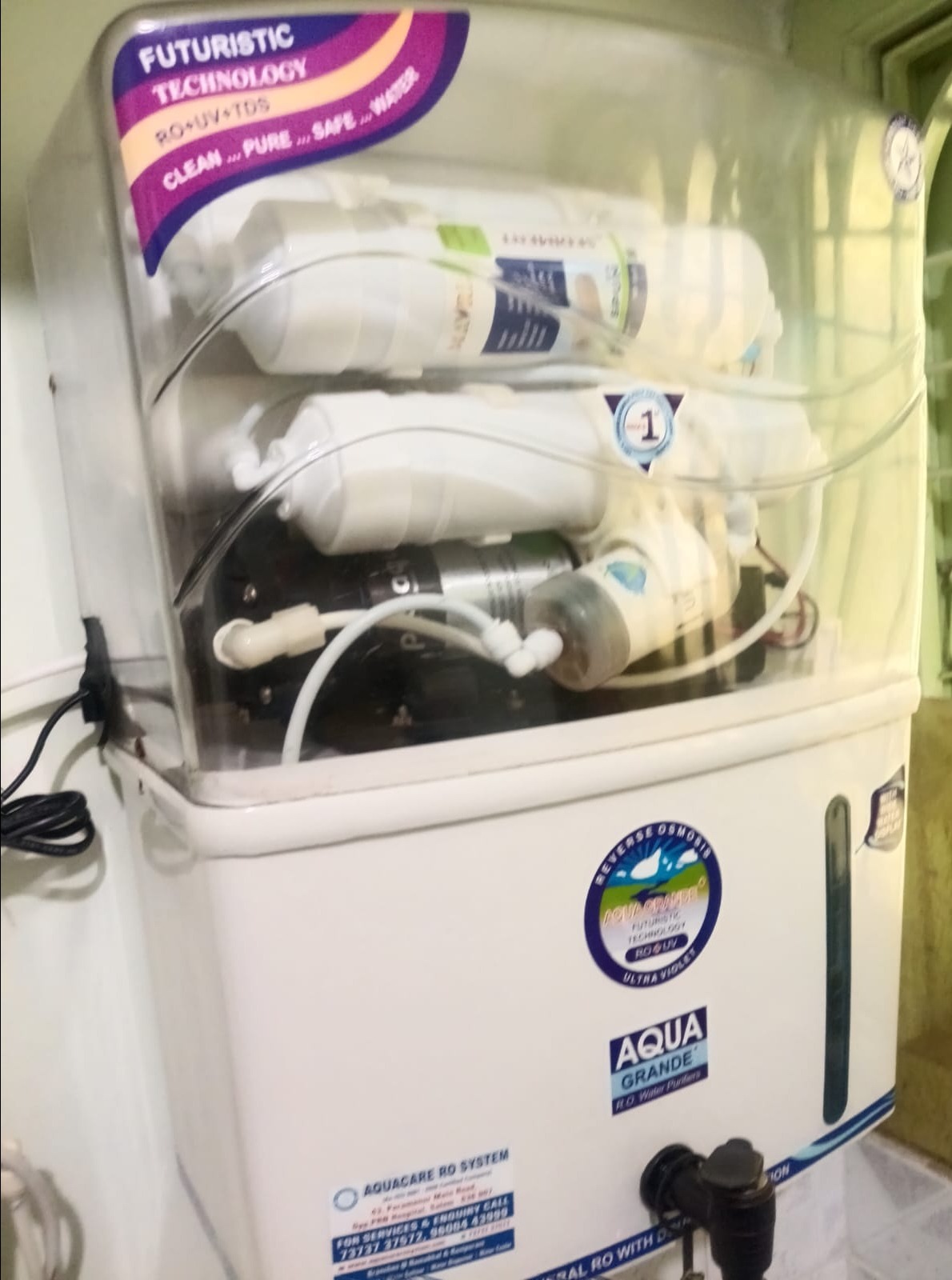 Aqua Grande RO Water Purifier. It uses a multi-stage purification process including RO, UV, and UF technology to remove impurities, bacteria, and viruses. The system operates automatically, turning on when the water level is low and off when the tank is full. For Service: 7373737572